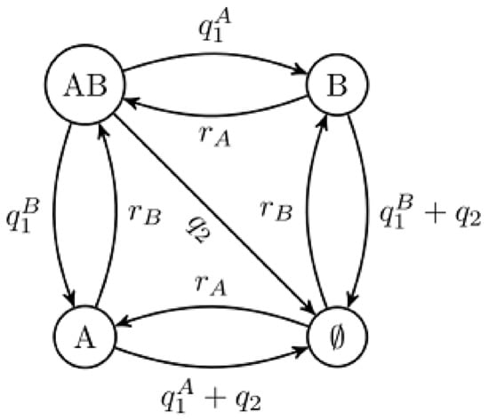 To more clearly illustrate this methodology, let us analyze the example proposed by the authors. Let us consider a network system composed of two power lines, A and B. The states related to the functioning of this system are represented by the set . The labels of these states represent the non-faulty components (i.e., both A and B are non-faulty in AB, whereas both are faulty in ∅). The common cause failures are modeled by considering the following three events: