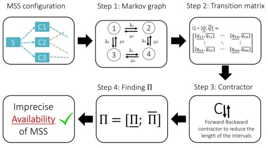The paper is organized as follows: In Section 1, we detail the imprecise Markovian model in terms of dependability. In Section 2, we present the original study, which deals with the use of the imprecise Markovian model in terms of dependability, and we show the negative aspects of the method. In Section 3, we briefly describe the interval contraction methods. In Section 4, we present our contribution for the purpose of estimating the imprecise availability of an MSS. This method takes all the constraints into account with the aim of computing the availability of a complex MSS. To understand all the steps of the methodology, numerical examples are presented and compared to other results obtained by different existing methods (IUGF [30], BUGF [43], and exact method). We conclude the paper with a discussion and a summary statement.