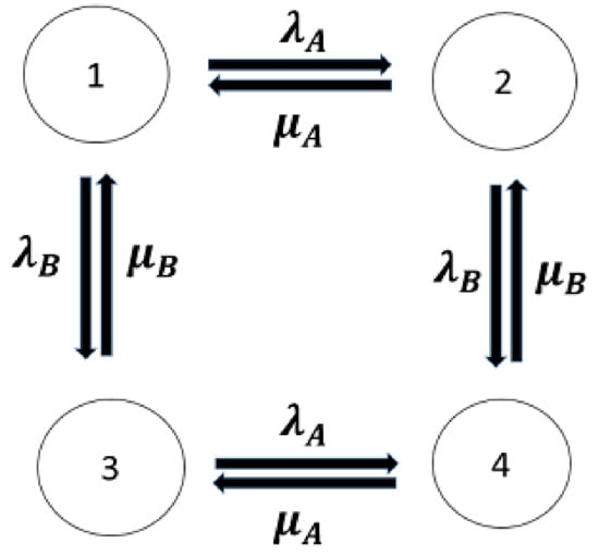 To simplify, any interval is written as x. Moreover, represents the rate of AI, represents the rate of BI, and represents the rate of CAB. Similarly, let be the repair rate of B and be the repair rate of A. For the sake of simplicity, the authors excluded all simultaneous repairs. The transition rate matrix is then