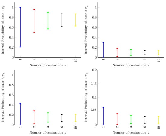 The authors evaluated the lower and upper stationary distributions using the above two transition matrices and solving and , without taking into account the fact that the sum of the steady probabilities is equal to 1 (). For the stationary distribution, the authors found