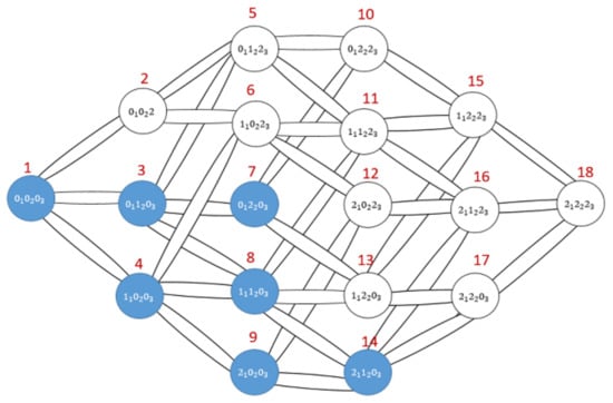 The notation indicates that component j is in the total functional state, the notation indicates that component j is in the partial working state, and the notation indicates that component j is in the state of total failure. The performance level g of a state is computed by considering the performance level of components. Thus, the state 1, which is denoted by , refers to the state where all 3 components are totally functional. The components 1 and 2 are in parallel so that the obtained performance level is equal to the sum of the two performance instances: . The component 3 is in series with the parallel configuration of 1 and 2. Thus, the system performance level g is equal to the minimum, i.e., . We compute the system availability when considering a demand level . Consequently, we consider the system working states when the total performance level is greater than or equal to w. In Figure 6, the colored states represent working states.
