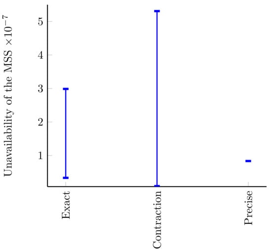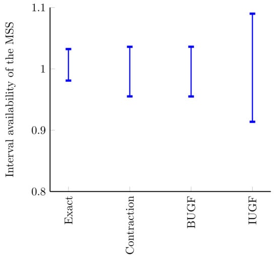The system availabilities calculated using the IUGF method and BUGF method are shown in Table 7. To obtain the availability using our proposed methodology, we first use the FBP technique to solve the system of equations by contracting the intervals. The system of Equation (1) is equal to zero (18 equations) plus one additional equation representing the fact that the sum of each steady availability term will be equal to 1. Following the steps of the methodology, we find our imprecise availability. The obtained results are represented in Table 7. The system availability of the exact method is also given in Figure 7 and Table 7.