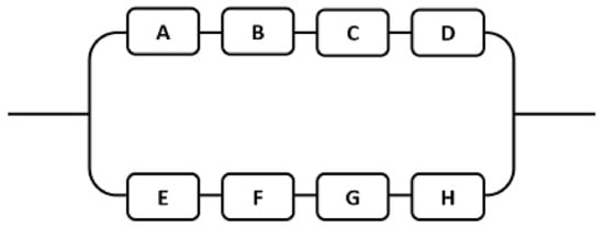 We have studied the accuracy of the FBP method regarding the exact, the IUG, and the BUGF methods. We now show that the proposed methodology also remains efficient when the system has a large number of states. To illustrate this, we apply our methodology to the following case study. We aim to compute the availability of the system presented in Figure 8. The system is composed of eight components: A, B, C, D, E, F, G, and H. The transmission flow of the system is considered to be from left to right. The four components B, C, E, and H have states of working (total working and total failure). The three components A, F, and G have three states of working: full working, partial failure, and total failure. The last component D has four possible states: total failure, degraded functioning of type 2, degraded functioning of type 1, and full working. We deduce that the number of system states is . The values of the failure and repair rates of each component are presented in Table 8 (the parameters and are used to represent the repair rate i and failure rate i, respectively, of component k).