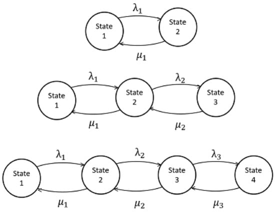 Since we assume that the components are independent, we can construct the Markov graph for each component (Figure 9) in order to determine its interval transition matrix. We then apply Equation (1) to find for each component, where . Finally, we compute the availability of each component by computing the sum of over all the working states. In this example, the availability of the entire system is presented in the following equation: