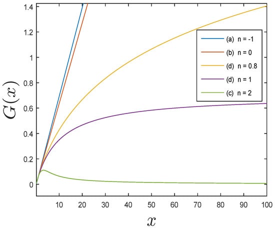 Let us now discuss the first term of the Equation (6), as in any population, particularly of cells of a plant, the rate of gain of a new mass per unit of time at all times t can be a function of important internal or environmental parameters, also of the same accumulated mass as a limiting element to growth (dense dependence with negative correlation). The form of the function that represents the gain and that corresponds to the first term of (6) is , which can be seen to be very sensitive to the parameter n. The form of G (x) is discussed below for some intervals of n, with constant .