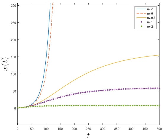 Figure 2 represents the size of the plant as a function of time, obtained from the relationship (6). It can be seen in Figure 2 that at the beginning of the time scale, the size of the plant tends to grow unlimitedly in a short time interval, for values of (blue, red). This situation does not agree with plants which grow in a common pattern. In nature, plants can present with accelerated growth in their first growth stages, but it then decreases in their maturity until reaching a plateau; after that, there is a decrease in their harvest, or after the end of each growing season []. For n = 2 (green), the plant’s size reaches a constant value very soon (there is no growth), which is not adjusted to the aforementioned pattern of plant growth. By assuming values of (yellow) and (purple), the simulated behavior of the size of the plant over time shows a shape that reflects the natural plant growth pattern.