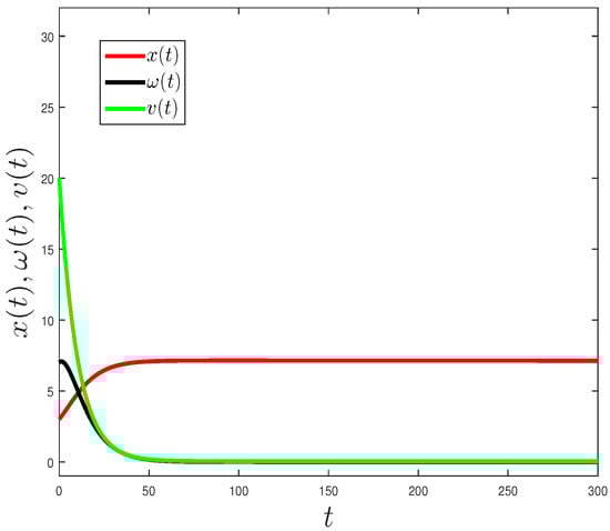 The eigenvalues of the Jacobian matrix evaluated at the point are: ; therefore, is locally stable. □