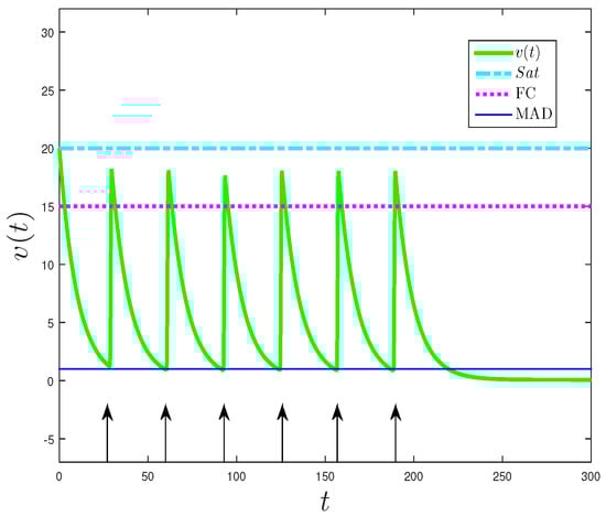 When applying the irrigation function to the system (9), there are fluctuations in the amount of water in the soil available for the growth of the plant, as shown in Figure 4. The horizontal lines mark the thresholds for the availability of water in the soil; most of the pores of Saturated soils (Sat) were occupied by water, which prevents the uptake of oxygen by the roots; Field Capacity (FC) is the amount of water in the soil after drainage; and Management Allowed Depletion (MAD) is the percentage of depletion without reduction of crop yield []. The vertical arrows indicate the times when irrigation is applied. Six irrigation applications were made during the season, where the first irrigation was carried out when the initial amount of water reached the MAD value, approximately at ; thus, the irrigation period will be 32. The amount of water supplied in each irrigation slightly exceeds FC.