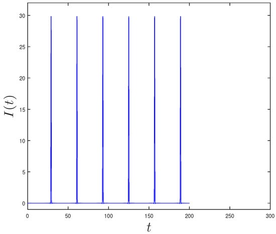 Now we incorporate irrigation in the system (9) to analyze through simulations how irrigation of a farm field influences plant growth. For this, an irrigation function is incorporated to state variable of the system (9). We consider a bounded, continuous, differentiable, and periodic irrigation function, Figure 6. Crop seasons were of 300 days, with irrigation during the first 200 days, an irrigation period of 32 days, with each watering lasting one day, and levels of irrigation of 30 volume units.