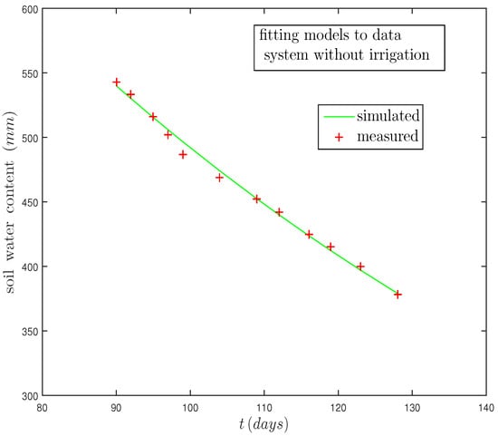 Data-processing and statistical analysis. The system (9) was solved numerically, adjusting the output for the soil water content, considering the case under water deficit. This parameterization was carried out using a nonlinear least squares curve-fitting method [], by occupying a script developed in Matlab© R2019a (Mathworks Inc., Natick, MA, USA). The actual data from the soil moisture obtained from Andarzian et al. [] were used to fit the parameters to find the best solution. The resulting parameter values of the model that minimized the difference between simulated and measured data are presented in Table 2. The performance of the data fit is presented in Figure 7.