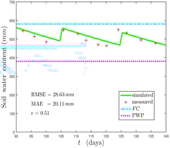 The performance of the modeled against measured values, depicted in Figure 8, showed good trends, highlighting the model’s capabilities to simulate the soil water content behavior. The green line was very close to the measured values (orange crosses), considering a cycle of two irrigations for the experiment on wheat. Regarding the statistical validation, the r = 0.51, with an RMSE and MAE of 28.63 and 20.11 mm, can be considered acceptable for irrigation purposes [,,].