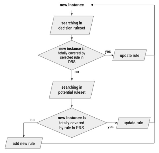 Figure 1 shows a high-level scheme of the proposed algorithm when an instance arrives to the system. When a new instance is observed, IDRA finds the best fitting rule in the decision rule set (DRS), which gives a class label. After that, the algorithm searches for the perfectly fitting rule, that is the rule that matches all its antecedents with the attributes of the example. Should that rule exist, the statistics are updated, while if it does not exist, a new rule is induced and added to the potential rule set (PRS). After a given delay, the true label arrives or can be calculated, so the algorithm updates the statistics of the model and sets the accuracy and error rates.
