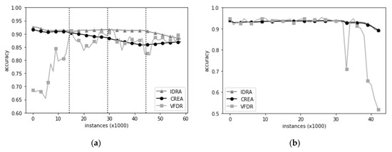 In Figure 2 we can see the evolution of the accuracy rate for all three algorithms in two experiments. We appreciate that both IDRA and CREA have more stable behaviors, while VFDR have more variable measures of accuracy. This last method is affected more by changes, however it is also able to recover in a suitable time.