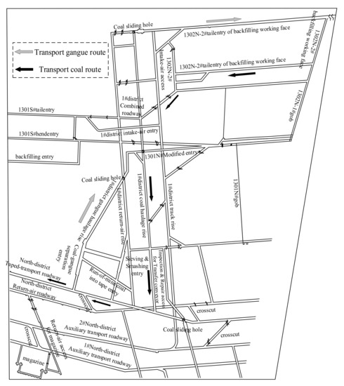 Schematic diagram of coal gangue logistics and transportation system in the Xinjulong coal mine.