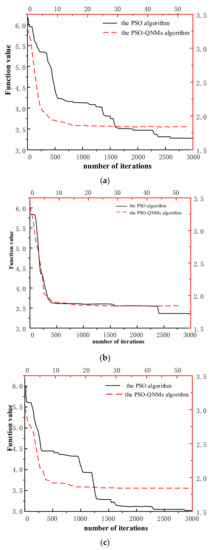 The PSO–QNMs [25] runs the particle swarm optimization algorithm M generation at the initial stage (population size is m), reaches the termination condition, outputs the current global optimal individual (defined in the PSO algorithm as ”zbest”) and gives this value to the initial value of Newton method, as indicated in Equation (10):