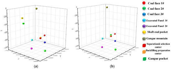 In order to realize the deep underground sorting and in situ filling technology model, an efficient, reliable, intelligent, and economical “coal mining–dressing–backfilling” integrated logistics production system for underground coal mines was established. To study the problem of optimal selection of nodes in the integrated coal gangue logistics production system of “mining–dressing–backfilling” in underground coal mining, the precondition is that the underground mining, sorting, filling, and transportation system links are analyzed separately from the perspective of logistics rationalization. The first and most important is the optimization and rationalization of the logistics system as a whole during the process of completing the underground cycle of mining, sorting, and backfilling from the working face. An underground mining and coal gangue transport system is relatively complex. The core of the two major systems for the coal gangue sorting system consists of the gangue and other waste filling system and the underground mining and coal gangue logistics production, which is to separate coal and gangue in the underground. Gangue is used as the main raw material for underground filling; due to the limited capacity of filling, the flow of gangue produced at the working face and the space relative position of mining and charging will determine the coordinated treatment capacity of mining and filling of the gangue transportation system. Insufficient gangue production will lead to obstruction of the underground filling work, and the surplus of gangue production will cause the excess gangue to be stacked randomly [42]. Therefore, it is necessary to reasonably design the spatial location relationship of key nodes for underground mining, selection, and filling coal gangue logistics systems to ensure efficient and coordinated transportation of mining, selection, and filling. In order to optimize the coal mine production logistics system, the coal production and operation process are transformed into a logistics and transportation process. The integrated coal gangue logistics system of mining, selection, and filling includes two parts: gangue production supply logistics and gangue production logistics. In the transportation part of coal gangue logistics, the normal output of coal gangue is the most fundamental and essential logistical component of the transportation link. In an underground coal mine, the coal and gangue produced from the working face are transported through the complex and extensive transport routes. As there are more logistics nodes in transportation, there will be a certain suspension in the sorting center, the filling preparatory center, and the underground gangue silo, based on the efficiency of the whole system, which can be improved by setting a reasonable key node.