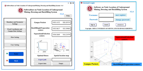 Based on the research results, a node siting system for an integrated underground mining–dressing–backfilling system in coal mines, referred to as MSBPS, was developed as shown in Figure 8. This is a logistics system node siting output system that is closely related to the research content of integrated deep underground mining, dressing, and backfilling. It only needs to input the spatial location coordinates of specific known nodes and the unit cost between each link, and calculates the solution independently to output the requested optimal node location information, i.e., it can output the spatial coordinates of node locations with one key. At the same time, it can obtain the three-dimensional spatial location relationship between the requested node location and specific known nodes, with a data export function and Chinese and English interface operation, which greatly simplifies the complexity of outputting node locations. It provides a fast, convenient, and accurate image and data export platform for locating nodes deep underground in an integrated mining, dressing, and backfilling logistics system, and is an effective three-dimensional dynamic system platform design tool for conducting further research on deep mining, dressing, and backfilling.
