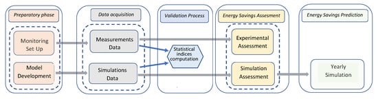 In the third step, a validation process was carried out to establish the validity of the simulation model presented. This process focused primarily on the most commonly statistical indices for the validation of energy building software and the comparison of measured and simulated outputs. This step is described in Section 6.2.2 and Section 6.2.3.
