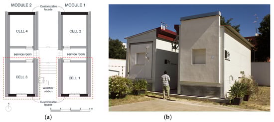 (a) Floor plan of the test cells; (b) external view of Cell 1 with the OVF (right) and Cell 3 with the UVF (left).