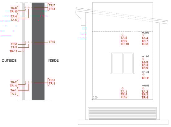 Regarding the OVF, velocity and temperature sensors were placed on the centreline of the air cavity. This way, air temperatures and velocities inside the OFV were measured in a central position between the internal surface of the outer slab and the external surface of the internal wall at different heights and in five different positions. Temperatures of the exterior and interior surfaces of the outer slab and the exterior surface of the insulating layer were measured at the same heights as air. A sketch of the location of the sensors at the OFV is shown in Figure 3, whilst the location of the sensors in the test cells is shown in Figure 4.