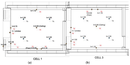 Location of the sensors in: (a) test cell 1; (b) test cell 3. (TA air temperature sensors, TR surface temperature sensors; h indicates the height in meters).