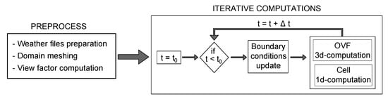 All that implies that at each time step, thermodynamic equations for the air flow, heat conduction equations through solid layers of the OVF and the ground must be solved at same time that radiative exchanges among the surfaces are computed to approximate accurately the thermal transfer through the ventilated façade.