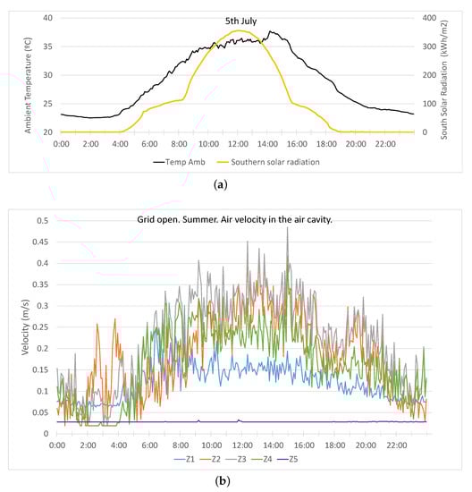 The impact of the radiation on the velocity of the air into the ventilated channel was investigated in [10,11] and Peci et al. [12] found that wind speed and direction and solar radiation are the driving forces of air flow and that if the wind speed is the prevalent driving force, temperatures are lower, and if buoyancy is the main driving force, temperatures rise. Many works have focused to analyze the influence of the values of solar radiation intensity in energy savings [3,4,10,13] while the effect of the solar radiation and building orientation in the thermodynamic and energy performance of the OVFs has been studied in [4,5,8,13,14].