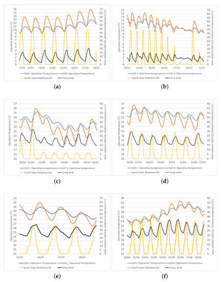 The southern façade of Cell 3 reproduces a constructive solution commonly used in social housing in Southern Spain, before the implementation of the first Spanish legislation for the regulation of energy demand in buildings, the NBE-CT-79 [40]. A cm window with 4.8.4 double glazing and an aluminum frame and slatted PVC shutters was installed on the southern façade of Cell 3.