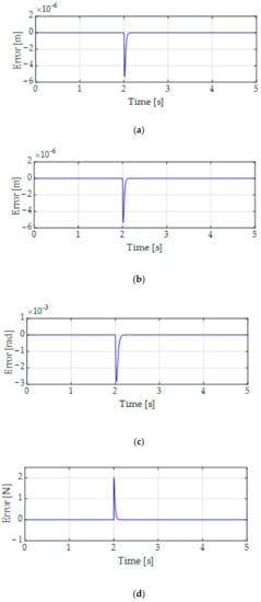 The results of the 16 interpolation parameters are shown in Figure 4 to satisfy the constraint conditions related to the proposed vertex expansion technique in Section 4. The maximum value of each interpolation parameter is 0.125, in which the influence of the load forces and torque as exogenous disturbance of the X-axis, Y-axis, and yaw at 2 s is shown in Figure 5. From these results, we confirm that the proposed LPV control system performs well.