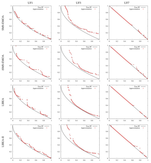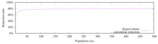IBEAs adopting indicators that use reference sets (e.g., , indicator, , etc.) are a design challenge since the optimal solutions are unknown. Consequently, reference sets cannot be adequately pre-established. Despite this, some researchers have studied diverse techniques to predict the reference set for these IBEAs [8,9]. In the evolutionary multi-objective optimization (EMOO) literature, the Lebesgue measure, also referred to as hypervolume indicator or S-metric, was introduced by Zitzler and Thiele [4] to evaluate the performance of EMOAs. This quality indicator possesses an attractive property—it is Pareto compliant [5]—that has called the attention of several researchers working on IBEAs. In particular, IBEAs adopting the Lebesgue measure benefit from not requiring reference sets because they exclusively employ reference vectors that are much simpler to state. Therefore, these IBEAs have been a practical approach to solving real-life applications where the characteristics of the problems are not known. Although IBEAs based on the Lebesgue measure are highly docile solving MOPs, their application is restricted by the computational cost of the Lebesgue measure, which grows with the number of objective functions. As pointed out in [10], this indicator cannot be calculated in polynomial time concerning the number of objectives except that . In addition, the complex characteristics of multi-objective problems (for example, multimodality, bias, non-separability, etc.) faced by an IBEA, further increase the computational cost in the search process for such algorithms. In other words, IBEAs use many more iterations (computational efforts) to approximate the real Pareto front of a problem. As a consequence, extensive investigations concerning the design of IBEAs using the Lebesgue measure as a quality indicator have been studied in the last few years [11,12,13,14,15]. To date, the development of EMOAs based on the hypervolume indicator is recognized as an actual area of investigation within the EMOO community, and this is precisely the topic of the investigation presented in this work.