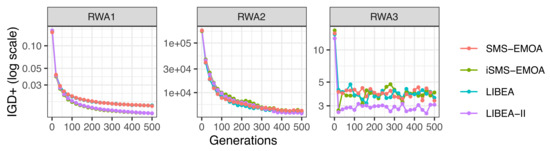 LIBEA-II was also tested on three real-world applications, precisely: the liquid-rocket single element injector design (RWA1), which has four objective functions and four variables, the ultra-wideband antenna design (RWA2), which considers five objective functions and ten variables, and the development of oil and water repellent fabric (RWA3), which optimizes seven objective functions with three variables. In this case, LIBEA-II was also compared with the same IBEAs used for the UF test instances. Remarkably, LIBEA-II was able to obtain non-dominated solutions with higher quality than those found by the other three IBEAs, since the average value from both quality indicators, i.e., and , was the best. The superiority of LIBEA-II was demonstrated in real-world applications since it obtained higher-quality non-dominated solutions and saved up to approximately 80% of the hypervolume calculations.