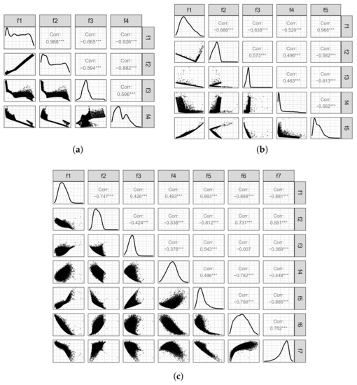 Finally, for the RWA3 problem, we can confirm what was noticed from the parallel coordinates plots, that is, the pairs of objective functions , , , and presents a negative correlations, which means the objectives in each pair are in conflict with each other. Other pairs of objectives that present a negative correlation are , , , , , , , , and . The remaining eight pairs of objectives show a positive correlation, however, this does not mean that they can be removed from the problem since they show conflict with other objective functions.