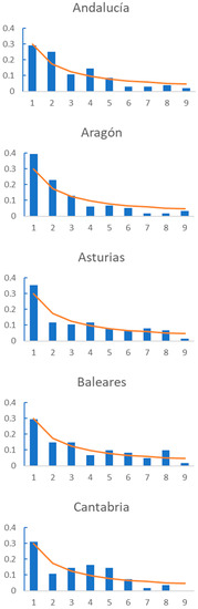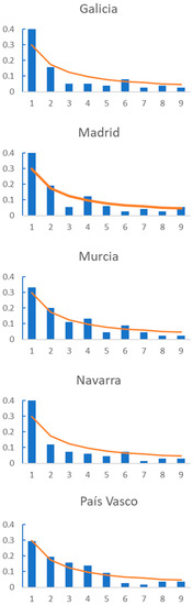 In addition, Figure 3 shows the graphic comparison for each AC, and we can observe that regions such as Cataluña, Navarra or La Rioja show a divergence in the frequency of the first digits from the trend defined by BL. As shown in Table 2, none of these regions fit BL., while regions such as Comunidad Valenciana or Murcia have first figure frequencies that are very similar to that described by BL. These are regions for which the number of daily deaths fulfil BL.