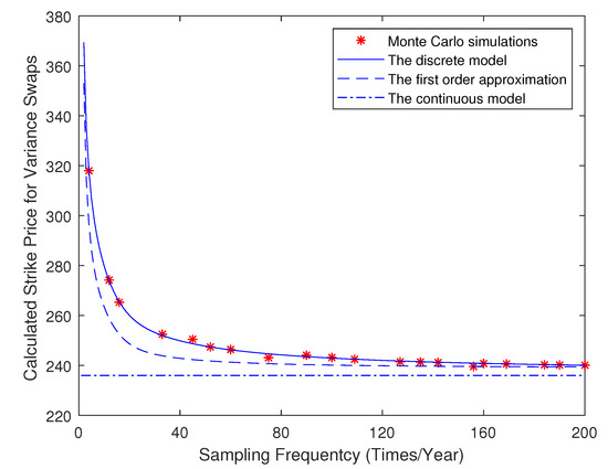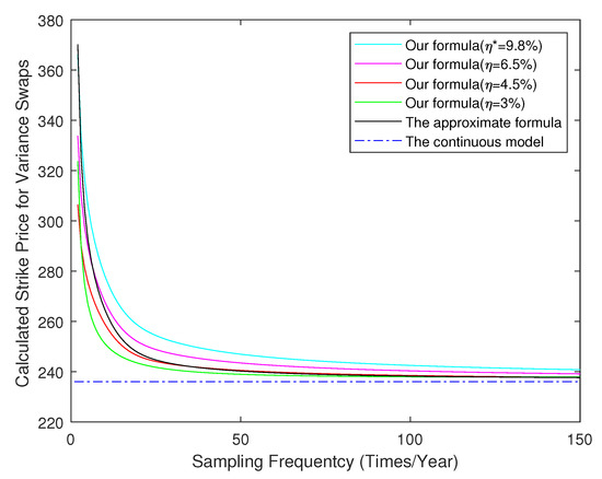 By observing the form of approximate formula, when the sampling frequency is large enough, the influence of stochastic interest rate is very small. This means that there is little difference between the results of different stochastic interest rates and the approximate formula in the case of large sampling. In order to verify this point, we need to compare the results of stochastic interest rates under different parameters. According to Cao [24] and Zhao [27], the long-term mean of stochastic interest rate has a great influence on the formula, but the mean-reverting speed h and volatility have little impact. Hence, to improve efficiency, we only select different long-term mean values, then take and . Figure 2 shows that when the sampling frequency is small, there is a large difference between the variance swaps prices calculated by the long-term mean of different stochastic interest rates; However, with the increase of sampling frequency, the difference between these prices and the price of the approximate formula becomes smaller and smaller. This fact shows that the influence of stochastic interest rate is indeed very small when the sampling frequency is large enough. What’s more, when the sampling frequency reaches 150, the maximum error of the approximate formula does not exceed 0.8, which means that the approximate formula proposed in this paper is reliable.