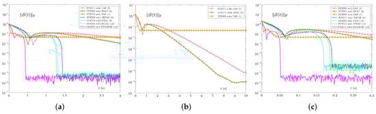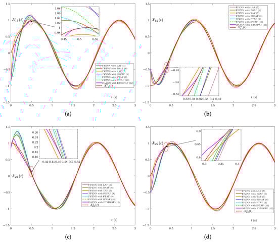 and denotes the theoretical solution of the Equation (1), in other words, . Besides, in this simulation, some public parameters are: , ; the parameter of AF (6) is set as ; the parameter of AF (7) is set as ; the parameters of AF (9) are set as , ; the parameter of AF (10) is set as ; the parameters of AF (12) are set as , ; variable parameters (13) are set as ; and .
