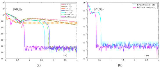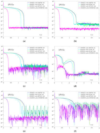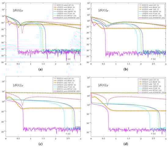 In this section, the FPZNN models with different AFs and DAZNN model (14) are applied to online solving dynamic matrix inversion problem, and the comparison results are shown as below.