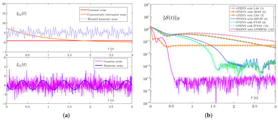Nevertheless, as a consequence of the convergence speed limitations, conventional ZNNs with linear activation function (AF) may not be capable of solving large-scale applications online [24]. Consequently, a nonlinear sign-bi-power (SBP) AF was presented in order to shorten the convergence time of ZNN models [25]. ZNN models that use SBPAF for acceleration have been widely reported [26]. However, all the studies mentioned above fail to consider the interference of noise, yet noise is an inherent part of all practical applications [27]. As a result, many researchers proposed a novel class of ZNN models using an integral term to address issues that were affected by noise interference [28,29]. For instance, a modified ZNN model with implicit noise tolerance was proposed by Jin et al. in [30] for the solution of quadratic programming problems. A noise-tolerant ZNN model was investigated to calculate complex matrix inversion with noise [31]. For further research, a unified framework for ZNN with an integral term was investigated, and its superiority to the conventional ZNN model was verified [32].