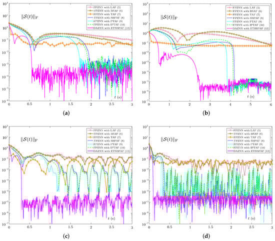 The general research considers only the ZNN model generated by the original error function (that is, ) design without considering the diversity of ZNN models. The diversity of ZNN models can provide more options for hardware implementation. It is easy to see that by designing different error functions, we can obtain different ZNN models based on [38] since the ZNN model is generated by error function and evolution formula [39,40]. Thus, to increase the variety of ZNN model, a novel error function is designed as