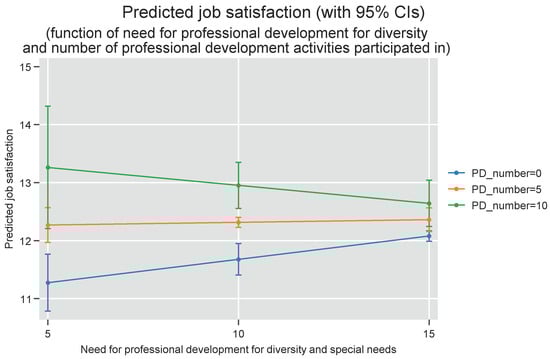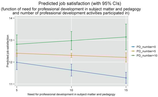 We hypothesize that the relationship between need for professional development and job satisfaction is moderated by the ability to participate in professional development activities. Consistent with a large body of literature, we expect that higher participation is associated with higher job satisfaction rates [23,28,29,30,39,40,41,42]. Regarding the relationship between need for professional development and job satisfaction and the moderating effect of participation, there is little prior knowledge form earlier literature to directly support a hypothesis. However, we expect that higher need will be associated with lower levels of job satisfaction: if teachers feel they have a high need for professional development, they may face some barriers and difficulties in their teaching process that may result in lower job satisfaction. Regarding the potential moderating effect of participation in professional development activities on the relationship between need and job satisfaction, we expect (given the positive effect of participation on job satisfaction that is found in the literature) that more participation in professional development activities might compensate the hypothesized negative relationship between need and job satisfaction, i.e., we expect positive sign of the interaction effect resulting in the slope becoming less negative with increasing values of participation.