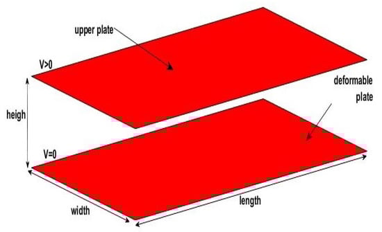 From a strictly engineering point of view, has a very important meaning because locally, it establishes how the deformable plate is stressed when the external V is applied. In the case under study, V determines an electrostatic field inside the device that locally generates an electrostatic force, and consequently, electrostatic pressure that acts on the plate and deforms it towards the upper one. This deformation, however, must be such as to avoid any contact between the two plates (in order to avoid any unwanted electrostatic discharges). It follows that must be closely related both to V (so that the deformation of the deformable plate can be controlled by V) and to the dielectric, mechanical, and geometric properties of the deformable plate.