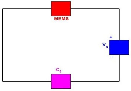 According to Remark 2, a basic capacitive control device is constituted by a circuit whose elements are the series of source voltage, , the capacitance of the fixed series capacitor, , and finally, the MEMS device can be exploited (see Figure 2).