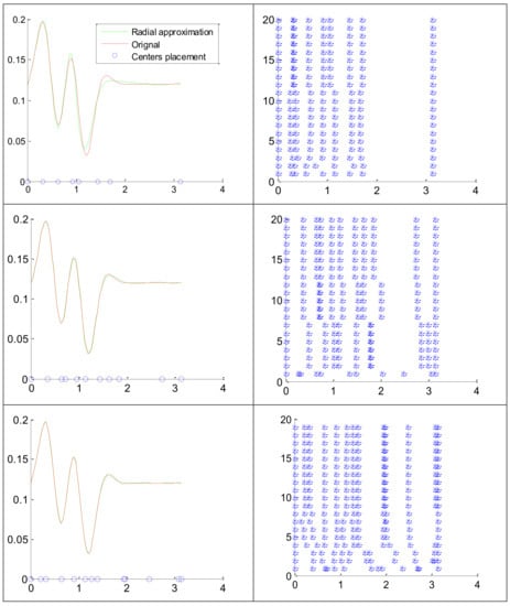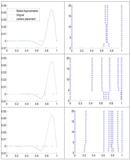 We can see, in the left column of Figure 3, the radial basis approximation corresponding to the last centers’ distribution, whose evolution is also showed at the right column, with the increase in the number of interior centers for the function , using 2, 4 and 6 interior centers, respectively.