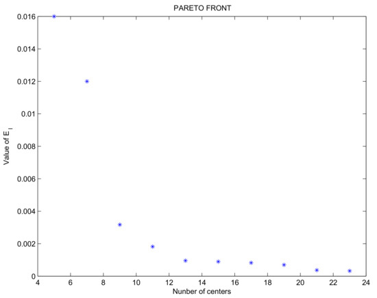 Therefore, the most important goal of these methods will always be to try to improve the adaptive fit of a population of possible solutions to a Pareto front constrained by these often conflicting objectives. In this case, these objective functions are to minimize at least one or several normalized discrete versions of some approximate errors; however, the intention to maintain the number of centers as small as possible is also taken into account, so that we allow the procedure to delete some of the obtained centers, when they become sufficiently close to each other and the same level of approximation can be retained.