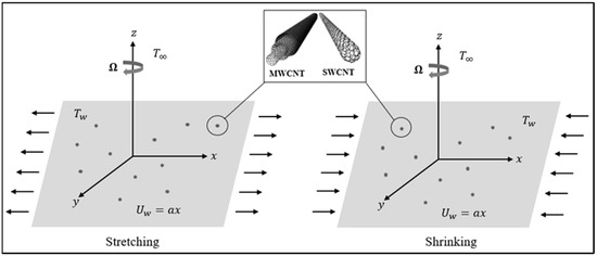 A steady 3D rotating boundary layer flow of a carbon nanotube past a stretching or shrinking surface is examined, and its physical model is illustrated in Figure 1. In Figure 1, , and are the Cartesian coordinates with - and -axes measured in the plane where nanofluid is in the region . The boundary is elastic and linearly stretched or shrunk by two equal and opposite forces in the direction of the -axis with the velocity . The fluid is rotating at an angular velocity Ω in the -direction. It is assumed that the nanofluid has a uniform wall and ambient temperatures, and , respectively. Based on the above assumptions, the governing equations of mass, momentum, and energy are (see Nadeem et al. [34] and Salleh et al. [36]):