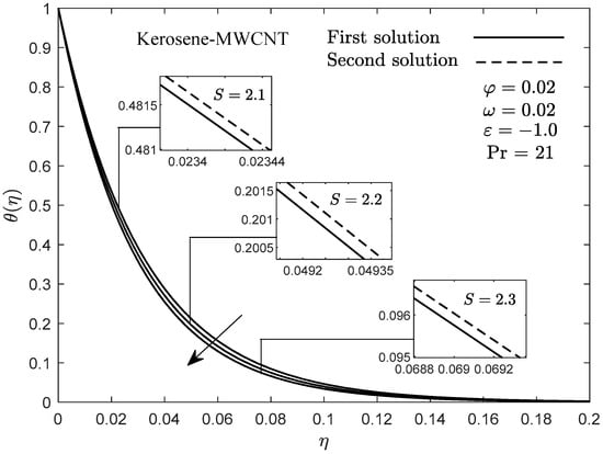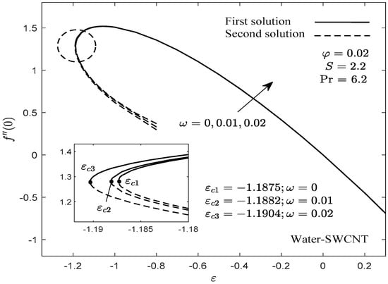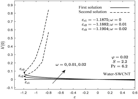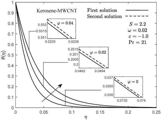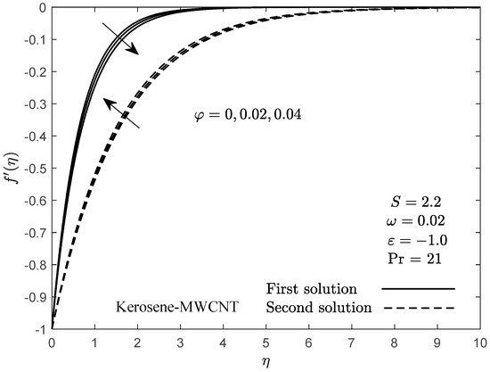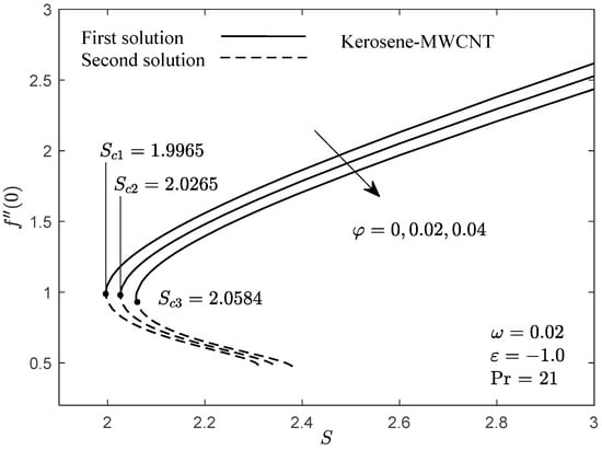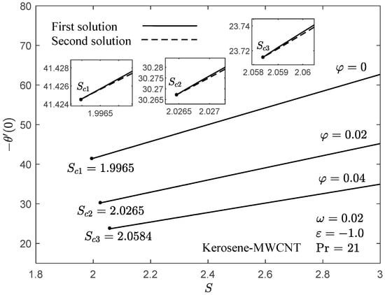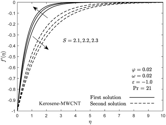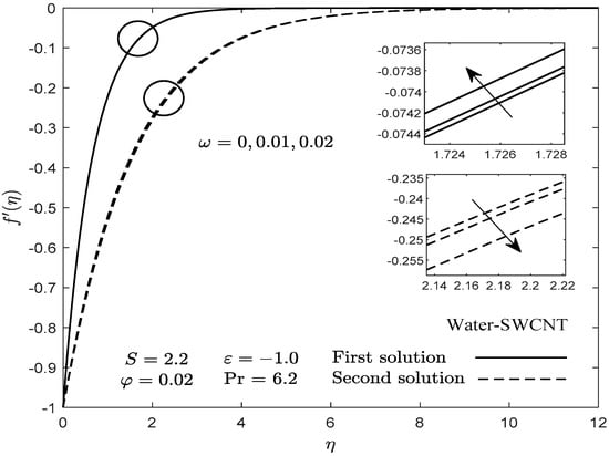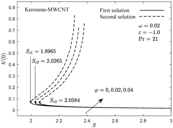 Since the surface is compressed or stretched in the -direction, thus, the effect of on is more pronounced than . As noticed in Figure 5, there is a slight increase in the value of when increases. Besides, the reduction in as displayed in Figure 6, is due to the thickening of the thermal boundary layer thickness as increases. This phenomenon prevents heat from the surface from being transferred to the surrounding fluid, and consequently, reduces . It is also revealed that as intensifies, and seem to increase, while the contrary phenomenon is noticed for . The increment of is influenced by the surface texture where suction causes heat to be transferred from the wall to the fluid. It is observed that non-unique solutions occur for the particular values of the suction parameter and no solutions when . Figure 4 reveals that in the case of regular fluid (), dual solutions exist in the range of . Meanwhile, as the value of increases from to and , dual solutions are obtained in the range of and , respectively. As can be seen in Figure 2, Figure 3, Figure 4 and Figure 5, the range of solutions that exist are different based on the pertinent parameters involved. Figure 2 and Figure 3 show that when different values of are plotted versus , the range of solutions increases with an increasing rotation parameter . However, Figure 4 and Figure 5 depict that it decreases when the nanoparticle volume fraction increases.