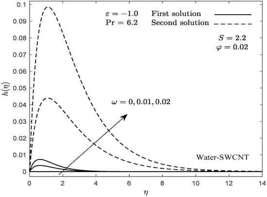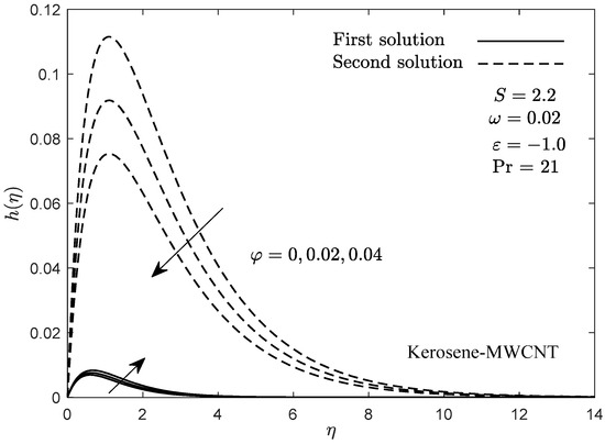 The numerical values of the local Nusselt number for some values of nanoparticle volume fraction , suction and rotation parameter are given in Table 5 when (stretching case). It is seen in Table 5 that the values of increase with increasing for both water/kerosene-SWCNTs and water/kerosene-MWCNTs. However, the opposite observation was found for as displayed in Figure 6. It demonstrates that the thermal conductivity formula affects the heat transfer rate at the surface since it involves nanoparticle volume fraction (see Equations (6) and (15)). As a result of this circumstance, numerous studies are attempting to acquire the most effective thermal conductivity, as noted by Li et al. [56] and Fabre and Murshed [57]. However, a similar pattern was obtained for the values of and where a higher suction rate leading to an increase in and . In contrast, the values of and decreased with the presence of the rotating fluid in the flow. This is due to the fluid rotation delaying heat transmission from the surface to the surrounding fluid, and the opposite trend occurs as suction increases.