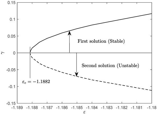 According to Harris et al. [38], the value of the smallest eigenvalue can be computed by relaxing the boundary conditions on , or . In this study, the condition as is selected to be relaxed, thus, Equations (30)–(33) are solved along with a new boundary condition using bvp4c solver in MATLAB software.