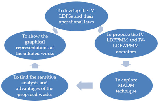 The paper is organized as follows: Section 2 gives an overview of IV-QROFS, power aggregation (PA), MM operators, and several related laws. Section 3 analyzes the IV-LDF setting and utilizes their algebraic laws. Section 4 introduces the IV-LDFPMM and IV-LDFWPMM operators and discusses some special properties and results. Section 5 demonstrates the beneficial optimum using the MADM approach and gives examples.