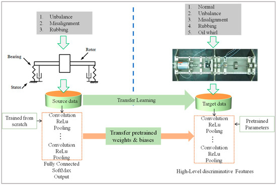 The limited nature of data from different defective states of actual machinery prohibits the use of deep learning models for autonomous feature extraction and diagnostics. Development of exact simulation models that replicate the response characteristics of the actual machinery is often computationally expensive. Although simple simulation models can provide insights into the characteristic behaviors of actual machinery in the presence of defects and are less computationally expensive, they do not account for all the uncertainties in the actual system. Transfer learning or cross-domain knowledge transfer could help to leverage the advantages of simple simulation models for fault diagnosis of the actual system. A schematic illustration of the basic idea of transfer learning in the context of the current problem is shown in Figure 1.