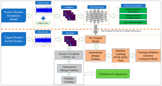 A large amount of source data is required to train, validate, and test a deep learning model with the highest possible degree of accuracy. That pretrained model can be used for automatic feature extraction from a limited dataset for a target task, or its weights and bias can be transferred to a limited target dataset using the concept of fine tuning [48,49]. In our case, the parameters of the model trained on simulation data are employed to extract high-level discriminative features from the target task of the experimental data. In transfer learning, the types of defects in the source data and target data are not necessarily the same [35,37,50]. A schematic illustration of the general workflow of the current work, which involves employing simple simulation models to detect, isolate, and quantify different types of defects in actual mechanical systems, is depicted in Figure 2.